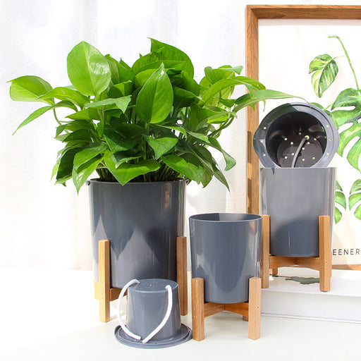 Modern Gray Plastic Plant Pot Stand Medium With Wood Rack