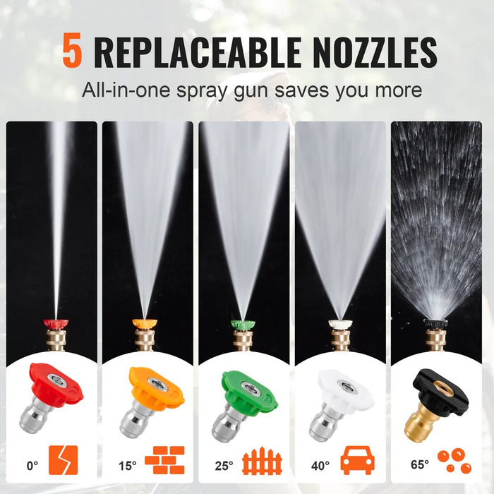• 5 Replaceable Nozzles: The pressure washer wand comes with 5 quick-connect metal spray nozzles (0°/ 15°/ 25°/ 40°/ 65°), ranging from high-impact water jets to gentle sprays. Best suited for your different cleaning tasks and made to cut down unnecessary expenses.