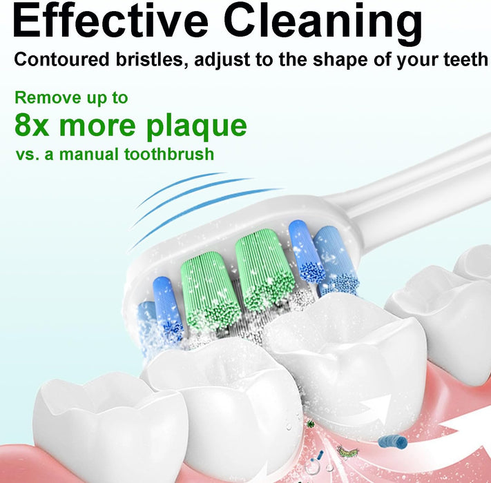 - Focused Cleaning Power: Designed with contoured bristles that naturally fit the shape of your teeth for efficient cleaning, even in hard-to-reach areas, they remove up to 8x more plaque compared to manual brushing.