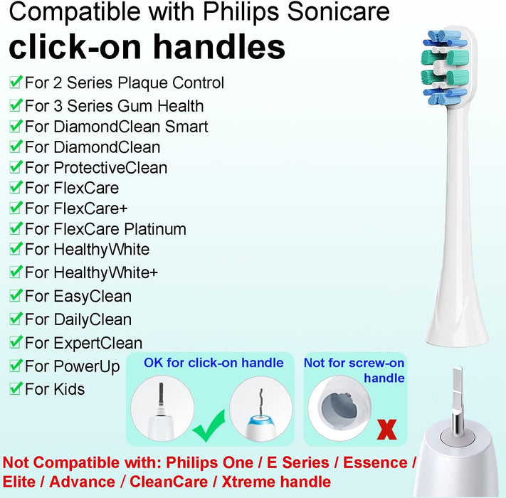 - Universal Compatibility: Our brush heads snugly fit all Philips Sonicare click-on models, offering a comprehensive range that includes ProtectiveClean, DiamondClean, and many more.