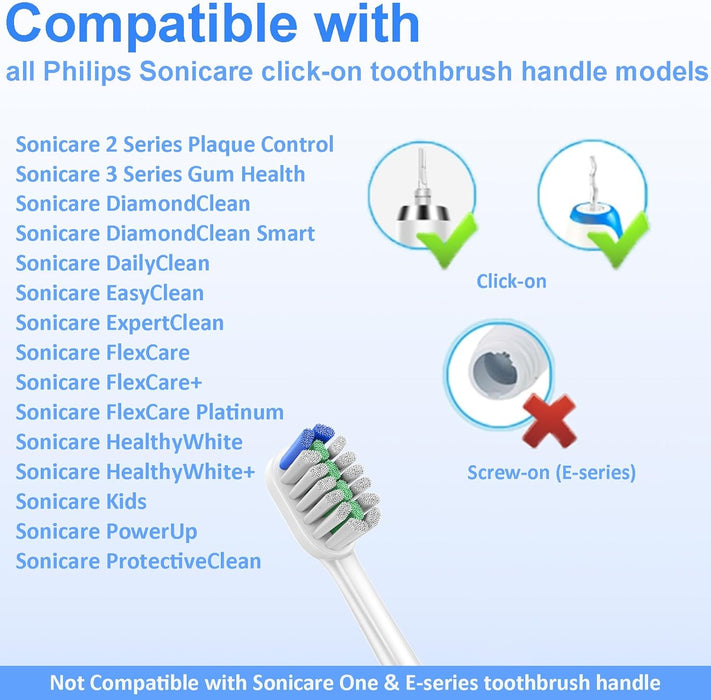 - Universal Compatibility: Our brush heads snugly fit all Philips Sonicare click-on models, offering a comprehensive range that includes ProtectiveClean, DiamondClean, and many more.