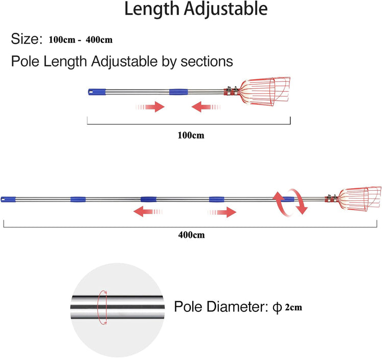- Adjustable Length: Easily extendable from 100 to 400CM, enhancing safety and efficiency in harvesting fruits from tall trees without the need for ladders.
