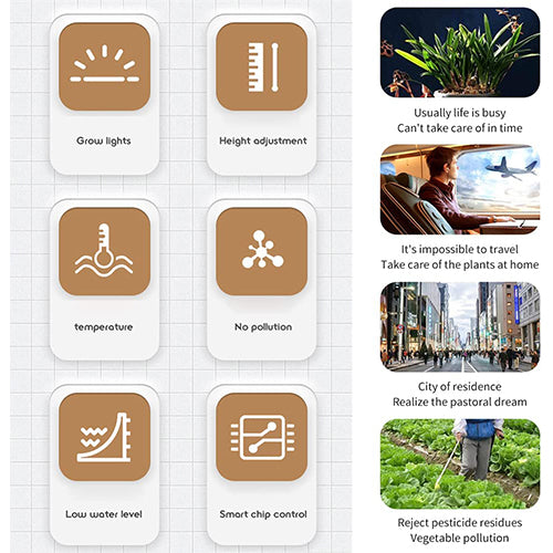 Every time the light is turned on, it will automatically fill the light for 16 hours. When the fill light is finished, it will automatically shut down and sleep for 8 hours, and will automatically cycle to fill light. With Grow Light: Intelligent chip control, automatic simulation of natural environment lighting, lighting plus enhanced lens, reducing plant growth cycle. Low Water Level Reminder: With a temperature display and low water level prompt, there is no need to open the planting trough to check if there is a water shortage.