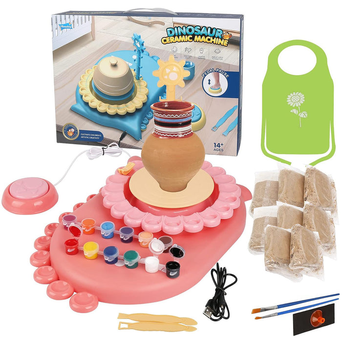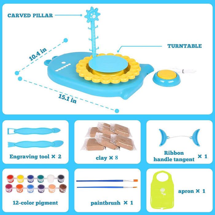 - ALL-IN-ONE KIT: Everything a young potter needs is right in this kit. It comes with 8 air-dry clays, 12 vibrant paint colours, 2 carving tools, brushes, dotting pen, and of course, the pottery wheel. Additional utilities like the pause key pedal, carving support stand, tangent, sponge, and a table sheet ensure minimal mess and maximum fun.