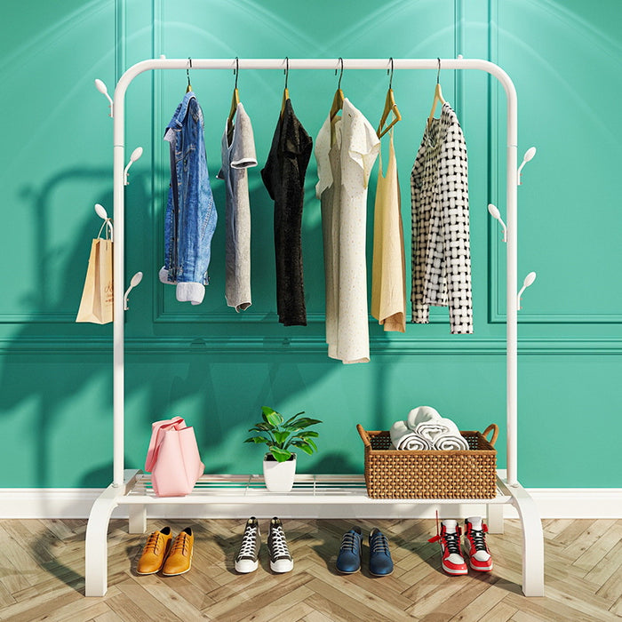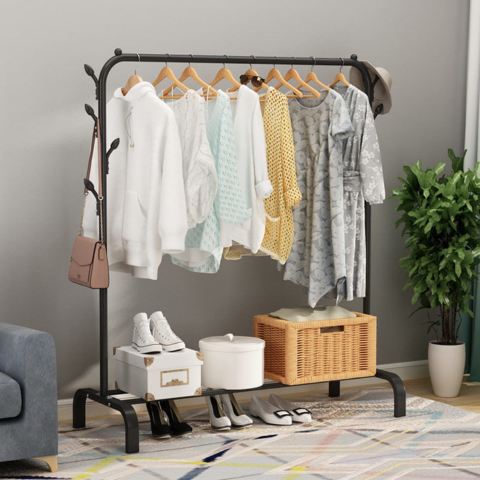 - Clothes rack with one smooth rod and 7 side round-headed hooks for hanging clothes, jacket, umbrellas, hats, scarves, and handbags, 1 bottom shelf for storage your shoes or boxes.