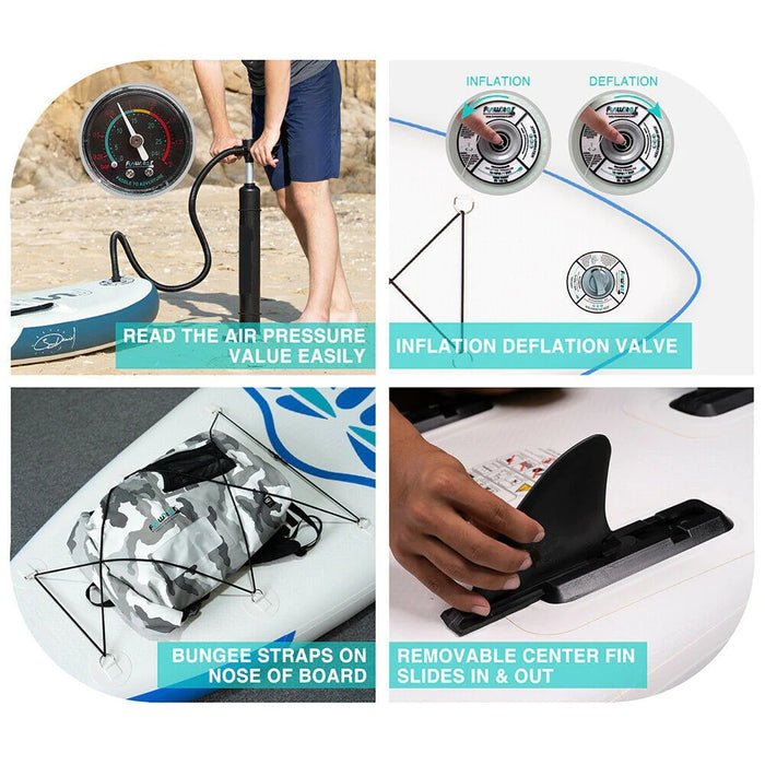 Tiki Inflatable Stand Up Paddleboard is made of 15cm (6 inches) brushed air cushion material, which is currently the strongest material in the industry. the size of the blue TIKI is 10'6''x33''x6'' (320x84x15cm).