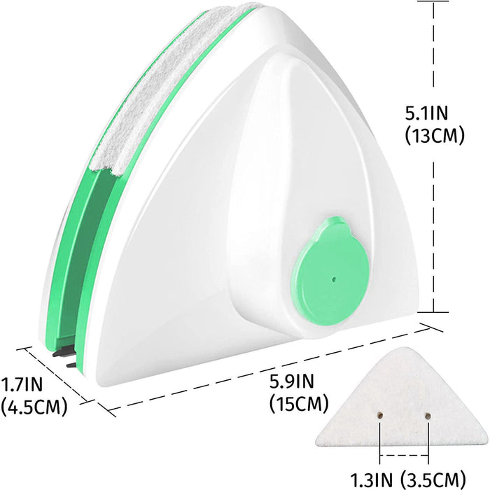 - [Unique triangular unobstructed design]: The magnetic glass cleaner with triangular design can be wiped to narrow areas on the window, and the triangular frictional resistance is small, which saves effort to clean the window, and decontaminates without dead ends. Built-in magnetic block, scraper, cleaning sponge, water reservoir. Replaceable wiper strip, cleaning cotton and fixed button.