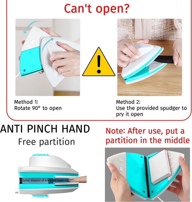 - [Anti-pinch partition]: For 15-26mm thick glass, a strong magnetic force, please use this magnetic window cleaner correctly, hold the handle of the window cleaner, it can be rotated 90° to open, or you can use the bar to open, watch your hands when opening or closing it. And we are equipped with anti-pinch magnetic isolation pads to ensure the safety of every user.