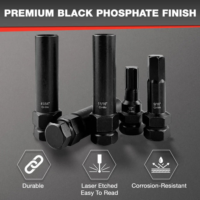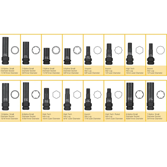 • Hexagonal lugs-15mm, 9/16, 12mm, 12mm with slots