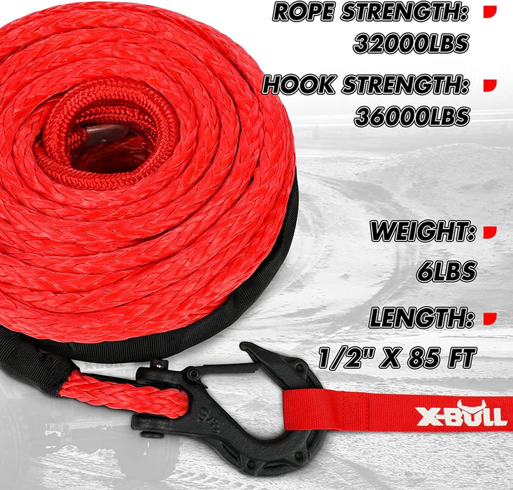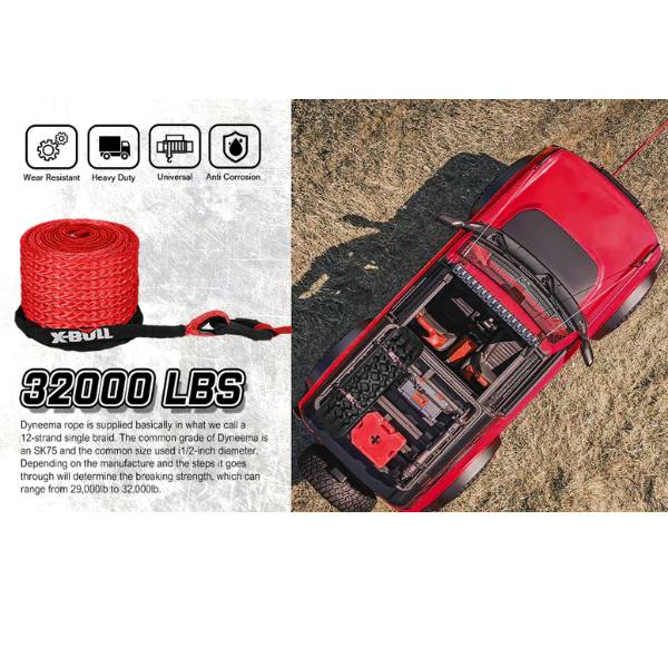 - Heavy-Duty Structure: Crafted with precision using X-Bull Winch rope 12 strands of Ultra High Molecular Weight Polyethylene(UHMWPE) synthetic fiber, this winch rope provides an impressive tensile strength of 32,000 lbs. Covered with a polyester coating, it weighs only 1/3 of a steel cable, ensuring rust-free durability.
